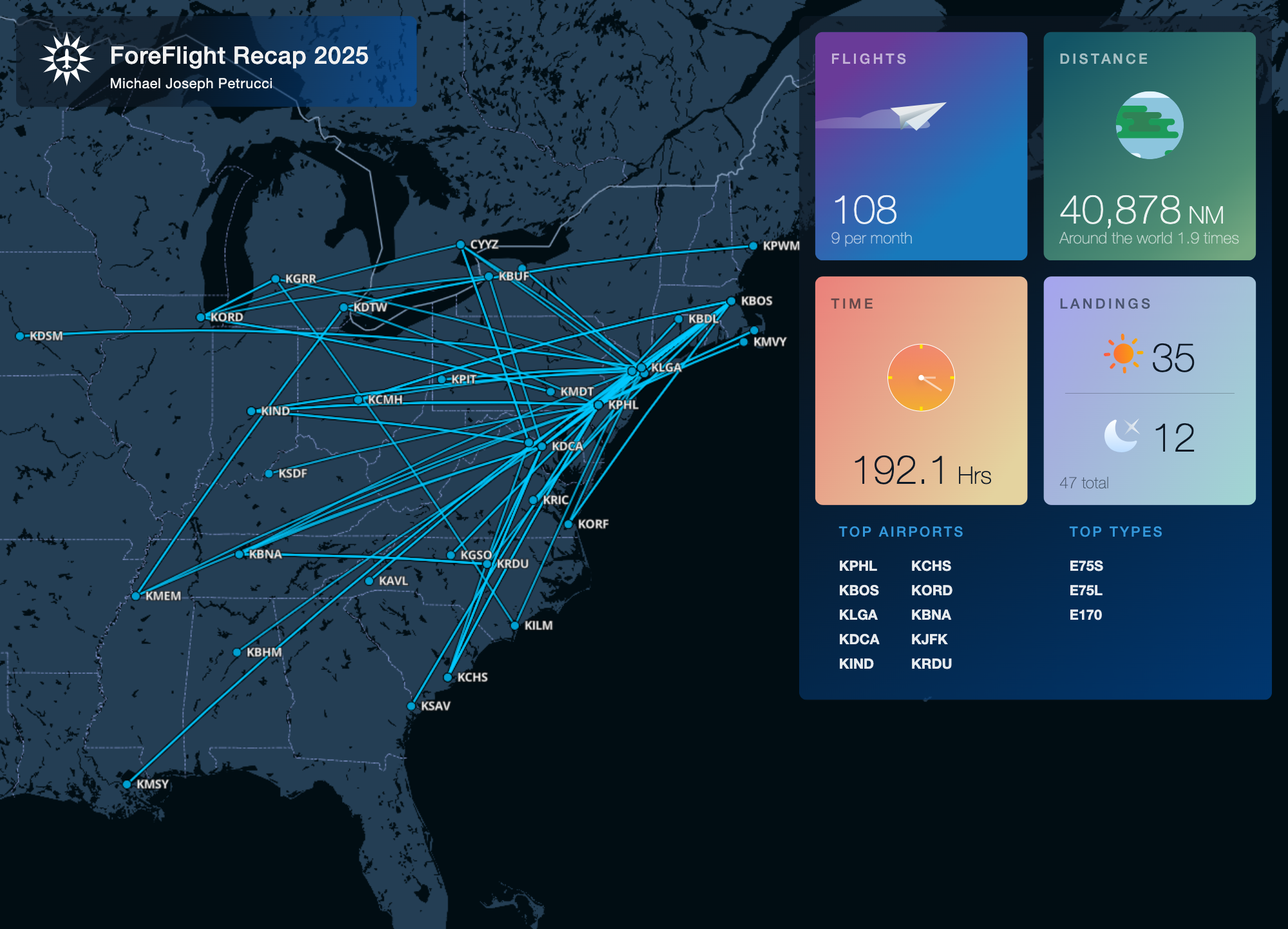 ForeFlight is my primary logbook (LogTen Pro is a backup) and the past couple years, ForeFlight has been nice enough to provide a little recap graphic.